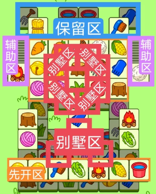 2.开局先消除橙色区的牌,这里压牌。尽量要让牌面保持在同一水平面,然后一层一层消除表面牌,不要跨层太多拿牌,等表面牌消除完后,以大别墅内互相消除为主。