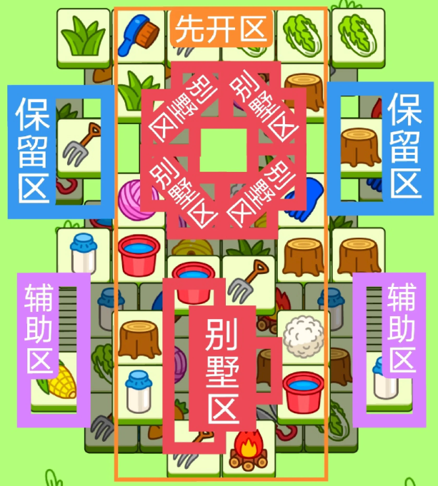 两个直角形大别墅,一个长型大别墅,开局先消除橙色区,然后按照一层层均匀消除表面牌, 哪里压牌比较多就先消除哪里,必要时可以用盲盒区辅助消除表面牌。尽量还是以别墅区内互相消除为主。蓝色区有叠牌,但是不多,全部保留到后期使用。