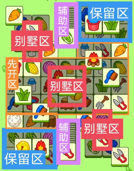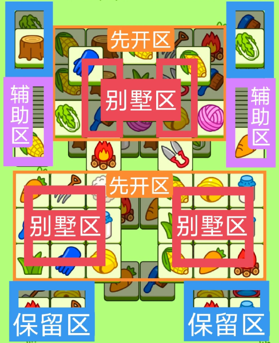 两个十字形大别墅,一个方形大别墅,开局先消除橙色区,然后按照一层层均匀消除表面牌, 哪里压牌比较多就先消除哪里,必要时可以用盲盒区辅助消除表面牌。尽量还是以别墅区内互相消除为主。蓝色区有叠牌,但是不多,全部保留到后期使用。