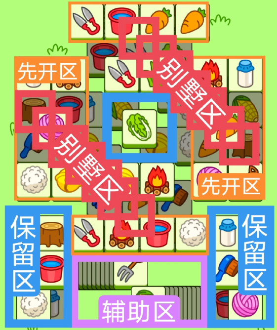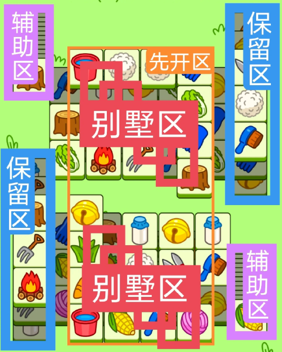 两个斜着的大别墅,开局先消除橙色区,然后按照一层层均匀消除表面牌, 哪里压牌比较多就先消除哪里,必要时可以用盲盒区辅助消除表面牌。尽量还是以别墅区内互相消除为主。蓝色区有叠牌,但是不多,全部保留到后期使用。