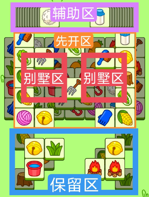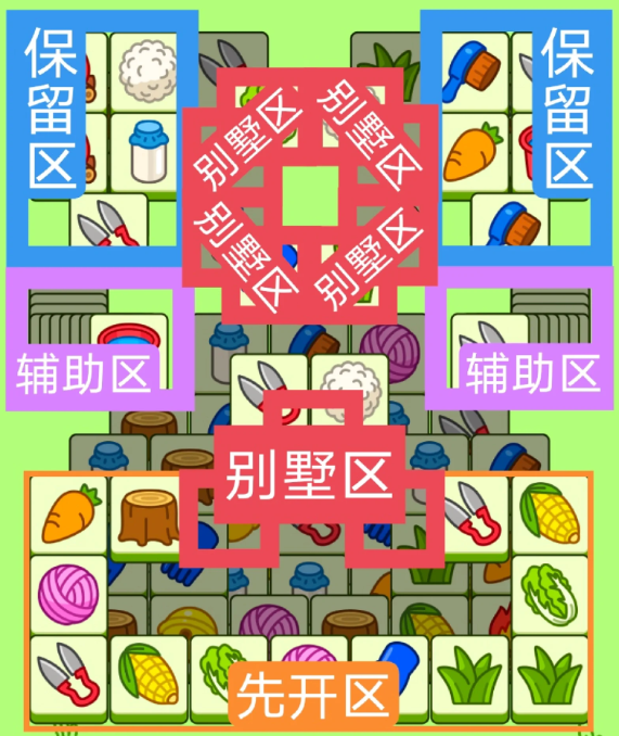 四个双叠牌小别墅,一个V字型大别墅,开局先消除橙色区,然后按照一层层均匀消除表面牌, 哪里压牌比较多就先消除哪里,必要时可以用盲盒区辅助消除表面牌。尽量还是以别墅区内互相消除为主。蓝色区有叠牌,但是不多,全部保留到后期使用。