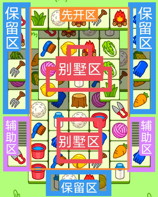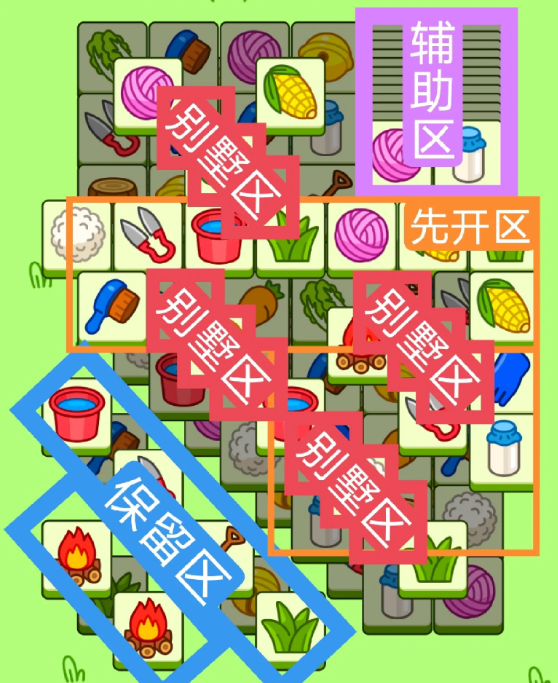 一个三角形大别墅,一个方形大别墅,开局先消除橙色区,然后按照一层层均匀消除表面牌, 哪里压牌比较多就先消除哪里,必要时可以用盲盒区辅助消除表面牌。尽量还是以别墅区内互相消除为主。蓝色区有叠牌,但是不多,全部保留到后期使用。