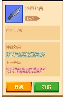 微信小程序疯狂骑士团是一款十分给力的放置冒险类游戏,游戏中装备神器不少,其中淬毒匕首神器效果为每次未暴击的攻击使你的暴击几率提高,是属于爆发性神器。下面是小编给大家带来的《疯狂骑士团》淬毒匕首神器强度介绍,感兴趣的小伙伴们一起来看看,希望对大家有帮助。