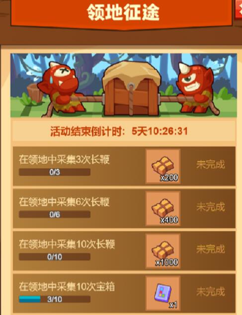 2、第二个任务就是在领地中分别采集10、20、40、60、80、100次宝箱,这个任务的奖励完成可以获得2、3、4、5、6个宝石卷,不过这里宝箱的拉取应该也是只能拉取自己领地的。
