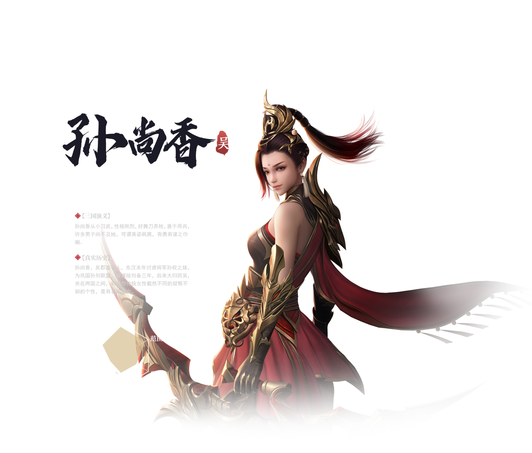 史:孙尚香,吴郡富春人,东汉末年讨虏将军孙权之妹,为巩固孙刘联盟,曾嫁给刘备三年,后来大归回吴,夹在两国之间,有着与传统女性截然不同的桀骜不驯的个性,是有名的侠女。