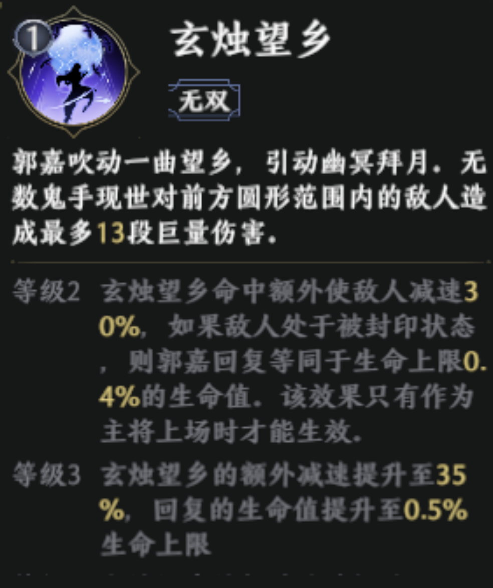 郭嘉的无双技能【玄烛望乡】也非常强力,能对前方圆形范围内的敌人造成最多13段巨量伤害。随着等级提升,还能拥有减速、回复等效果。