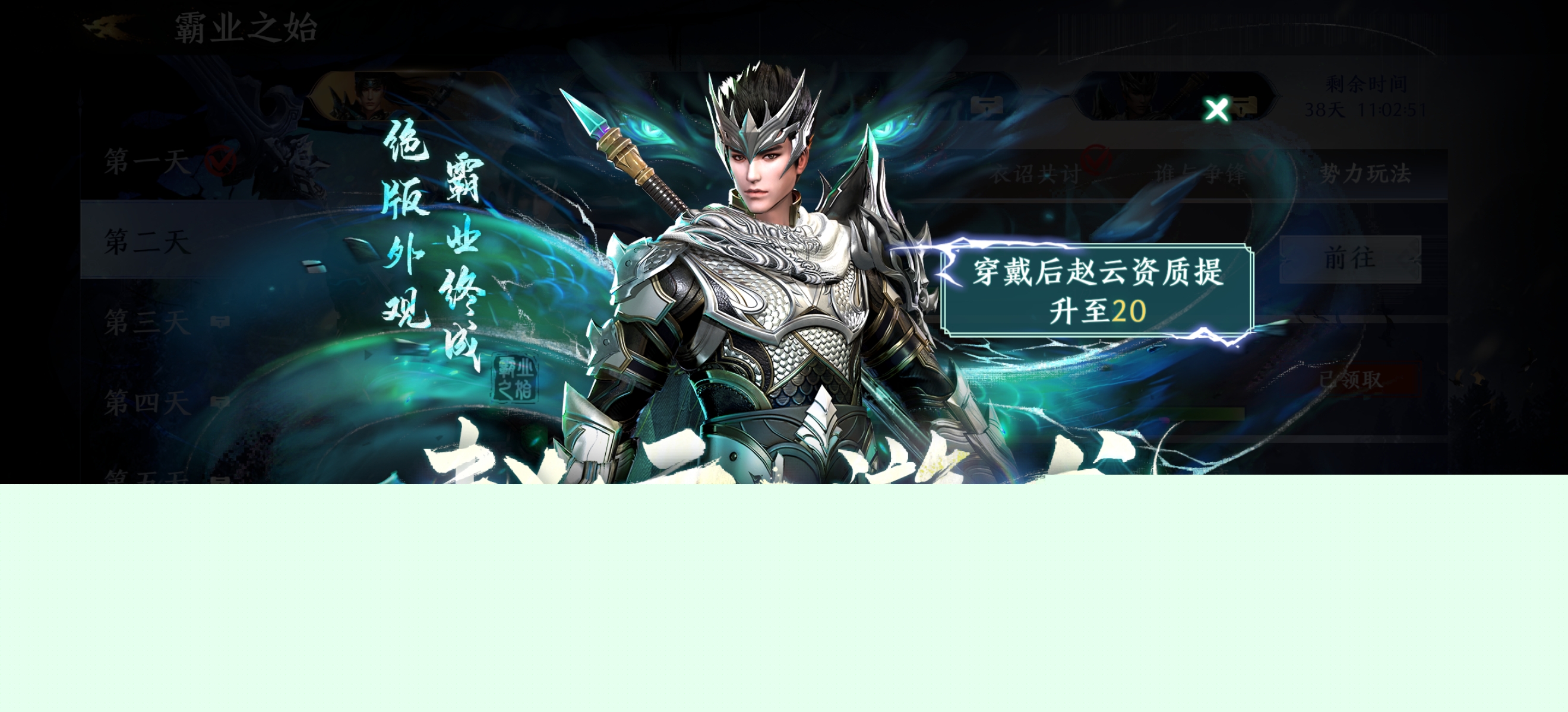 首先,赵云是通过第一期【霸业之始】活动免费获得的,而这个活动是分四期,后面几期活动同样能免费获得专属坐骑照夜玉狮子、神兵外观、专属皮肤。(不过这次测试时间较短,应该体验不到)