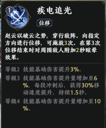 赵云1技能是位移技能【疾电追光】。这个技能释放时能进行三段冲刺,同时附带眩晕效果。在升级后,还能让技能基础伤害加成、提升移速等等。