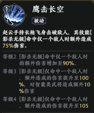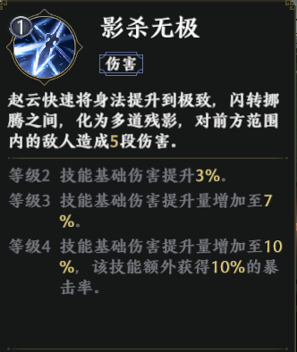 其技能2【影杀无极】能让赵云化为多道残影,并对前方范围内的敌人造成5段伤害。随着技能升级,基础伤害也会获得提升,等级4时还能额外获得10%的暴击率,是非常强悍的输出技能。被动技能【鹰击长空】还能使得【影杀无极】的伤害更上一个台阶。