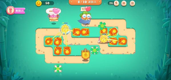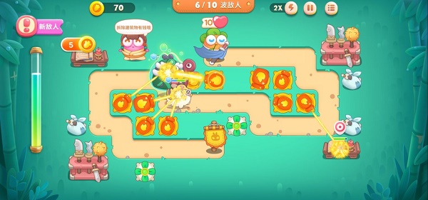 1.第一关可以在最下面建个一级风扇,可以帮忙减速+随机打机关,很好用。在右边位置放火炮清理障碍,障碍清除后建新火炮,这个时候专心清障碍。【如下图】
