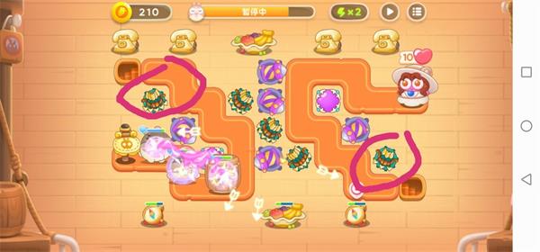 3.清理:5波左右,可以开始清理多重箭周围的果盘,再放上多重箭和烟花塔,保证火力充足。左上与右下的障碍物可以在图中标记的位置放上多重箭来清理。