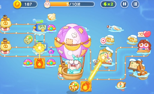 第5波天上飘来一只兔子,用手对着热气球不停摩擦就能把兔子打下来。掉下来的兔子就到你家园里常住了。注意划热气球的伤害不要把炮塔划没了。