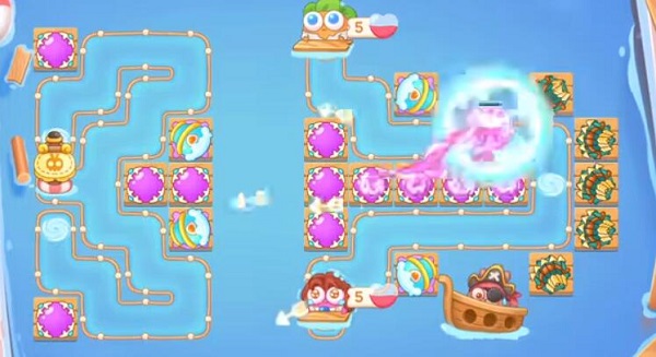 1、用电磁炮开局,先清理左边的道具,兔子没来打下面的章鱼。