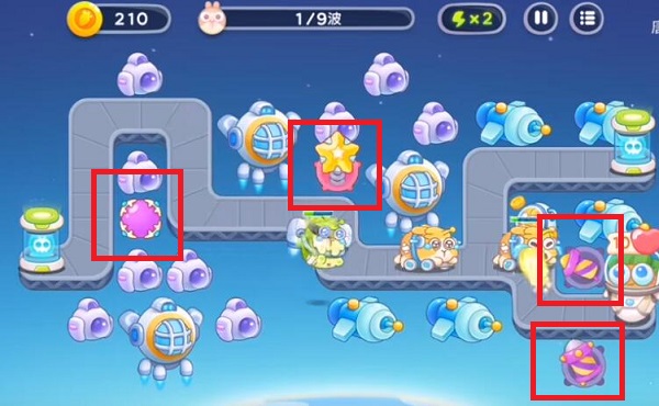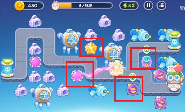 3、第4波中间增加星星塔,左边出口那里增加电磁塔,第5波最右边再放个火箭炮,清理上面的道具,中间放火箭炮清理怪。