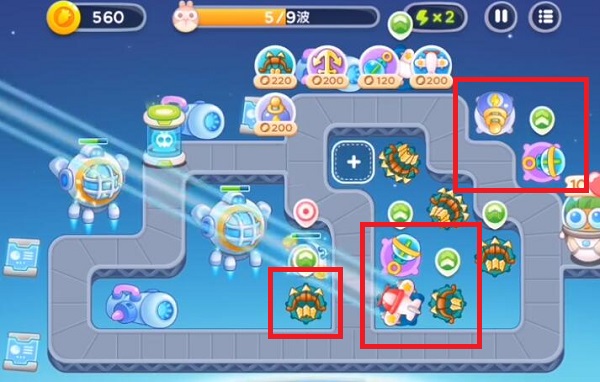 2、第2-3波右上角放个闪电塔和泡泡塔,第4-5波在右边下面放玩具飞机、分裂箭、泡泡塔。