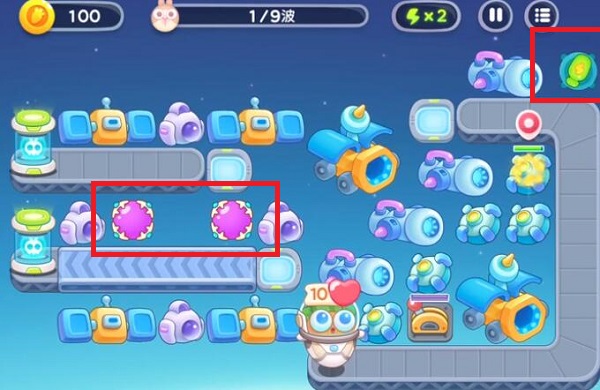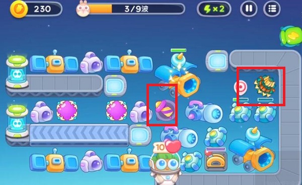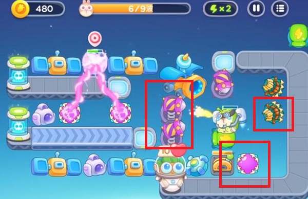 4、第7波在右边中间增加电磁炮,第8波增加分裂箭和火箭炮,第9波抓紧清理道具,再增加电磁炮和分裂箭。
