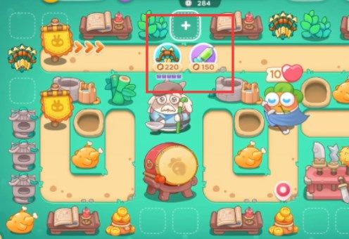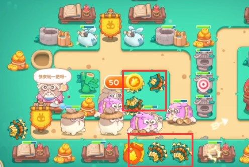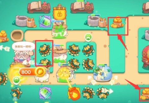 4、图中圈起来的道具打掉会给800金币,要全部都清掉,在中间再补充多重箭提高防御,边上的炮塔就可以安心开图了。
