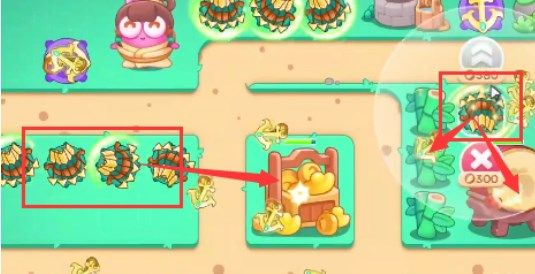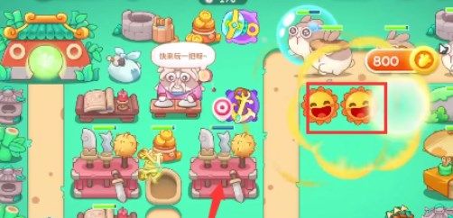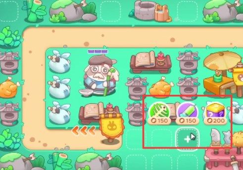 4、开一个道具就尽量放置上满级的鱼刺,之后将所有的鸡腿打给乞丐兔即可,它会给我们四个二级炮塔。