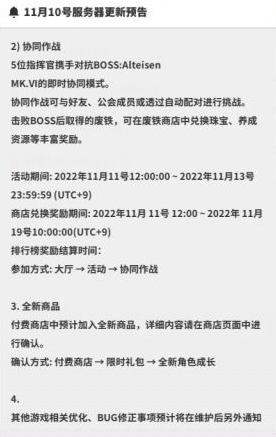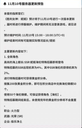 以上就是小编整理带来的《NIKKE胜利女神》11月10日更新公告一览,更多相关游戏攻略,请点击关注手游网!
