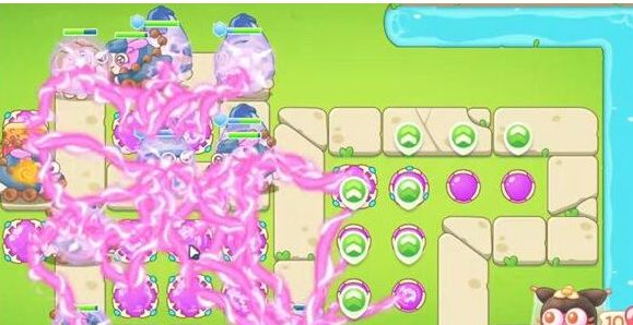 3、第二波我们需要迅速清理箭头所示的障碍物,把2号魔法球升满级且放置3号魔法球。