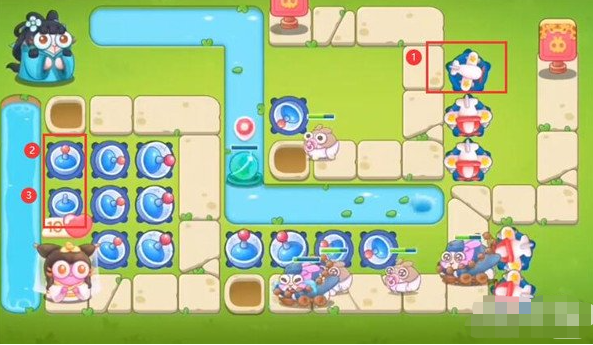 7、最后两拨补充炮塔,按照图中顺序进行补充炮塔,关键点还是解救小青。
