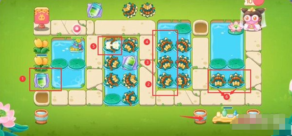 5、第9波在下面放一个鱼骨,障碍物全部清理,中间荷叶上面在放置多重箭,具体塔防如下。
