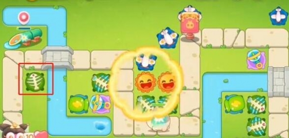 1、第一波开始,把右下角的鱼骨头升两级,中间道具清掉变太阳花。