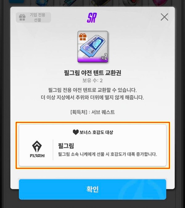 当送给属于特定公司或团队的妮姬时,有些礼物会大大增加好感度。例如,当赠送给“Pilgrim Nike”时,“Pilgrim Field Tent Exchange 优惠券”会大大增加好感度。