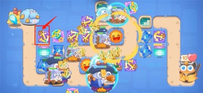 3、第三波左侧加一蓝色护盾塔,升一级,把船锚升满级,再加一船锚。