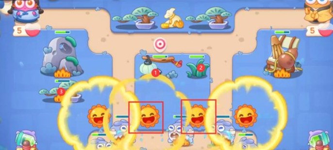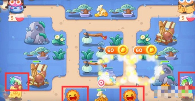 1.这两波没什么难度,需要大家将场上的道具升级,多放置鞭炮塔和太阳花,将火力集中在中间位置;