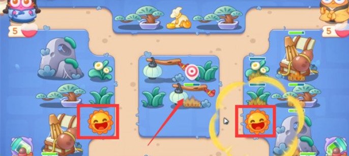 1.在下图位置放置两个一级太阳花,钱袋被打掉后,分别放两个太阳花升级到满级,锁定灯笼。