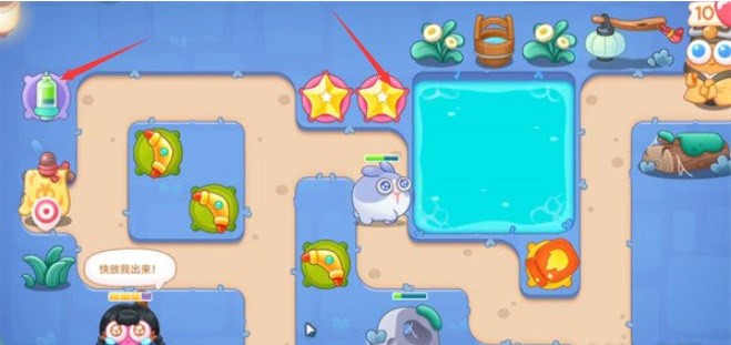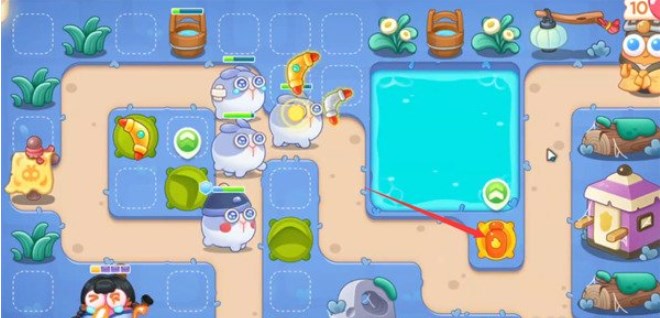 3、在箭头所示位置摆放一个瓶子炮并将攻击目标选择为宝箱,快速将宝箱清掉。