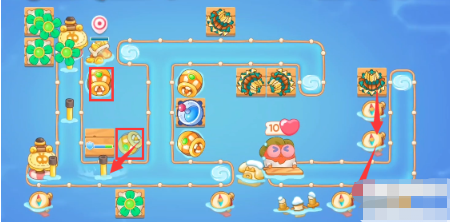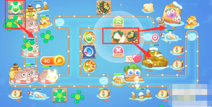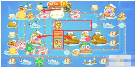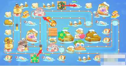 2、先放置一个风扇、鱼雷、多重箭,鱼雷打潜水兔,风扇打怪,多重箭打旁边漂流瓶。