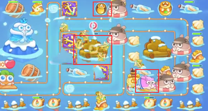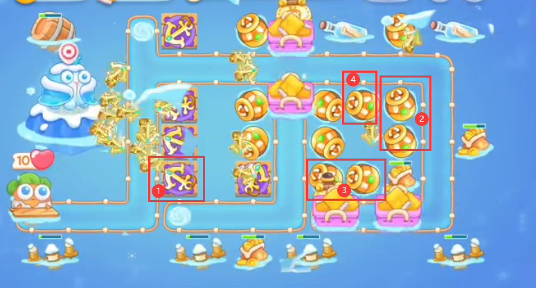 1、这关一定要有鱼雷和强力塔,强力塔推荐使用船锚、魔法球或弓箭。