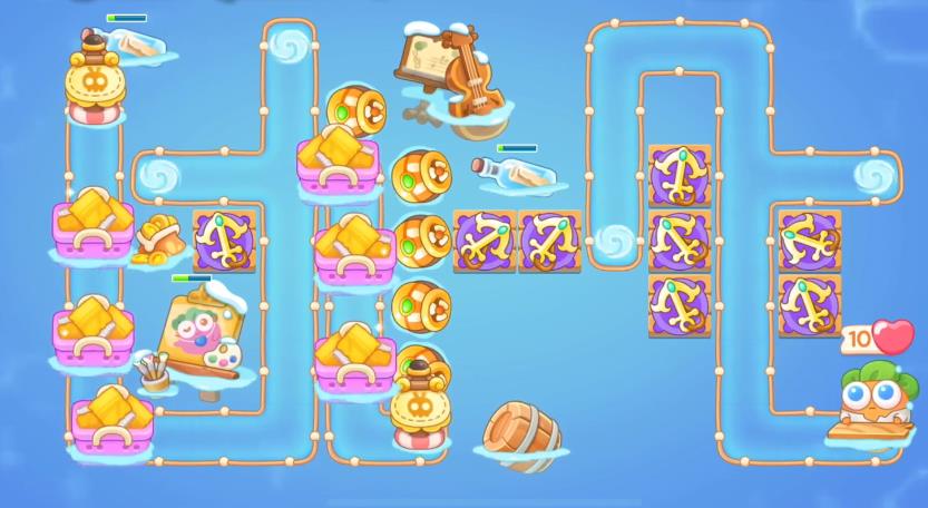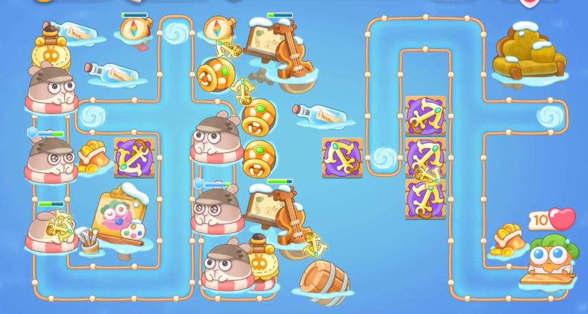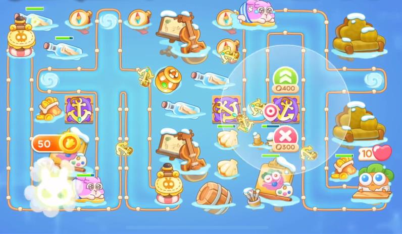 1、首先开局兔兔洞口放船锚和弓箭,先消掉右边贝壳。