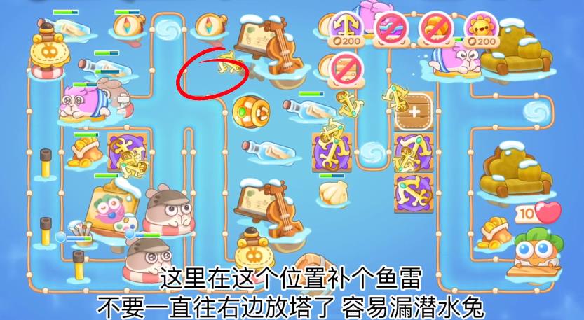 2、第二波在如图所示位置放鱼雷,不要总是在右边放塔,容易放炮潜水兔。