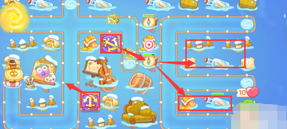 1、这关自带烟花和星星,有船锚、魔法球或多重箭即可开打。