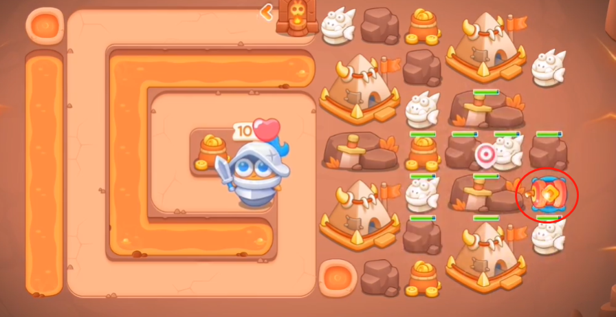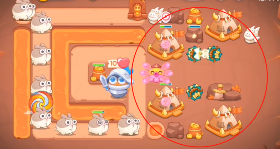 2、敌人会进入传送门过会出现,这种时候我们要快速布置防线,先将炮仗卖掉然后建造图中这些建筑并升级。