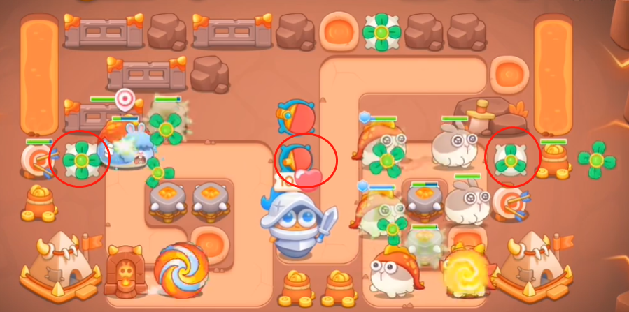 5、之后让左边的炮台将左边清理干净,获得足够钱后建造图中圈出来的这些建筑。