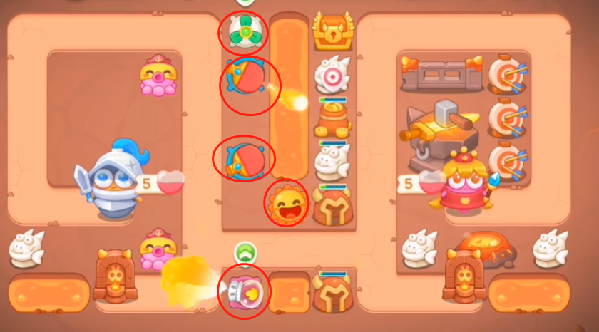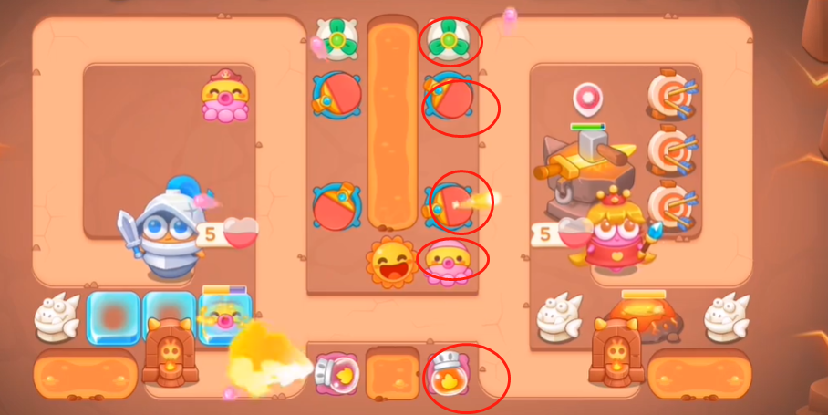 2、等金钱足够后在如图所示的几个地方建造炮塔让它们一边攻击建筑一边打怪。