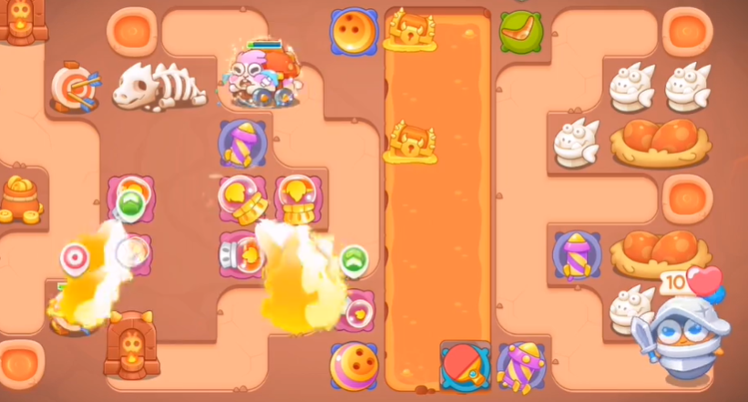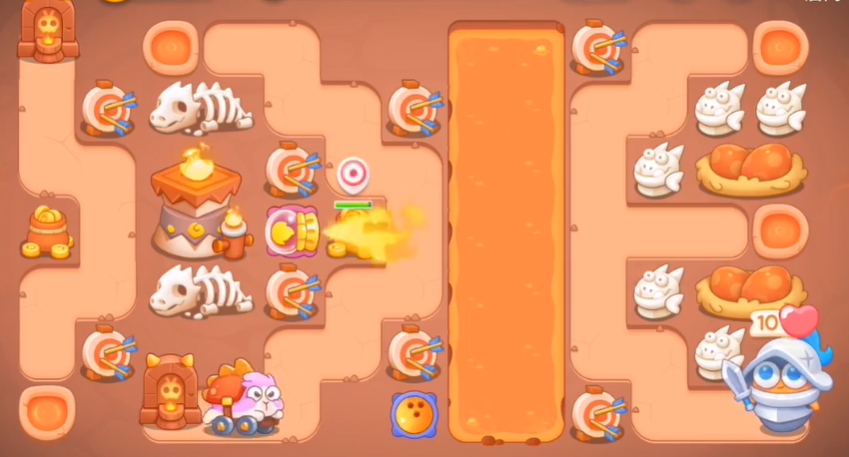 3、然后在上方建造一个保龄球炮塔攻击右边的靶子,靶子击破后放一个回旋镖炮塔,等钱够了在喷火炮塔上面建造一个火箭炮塔。