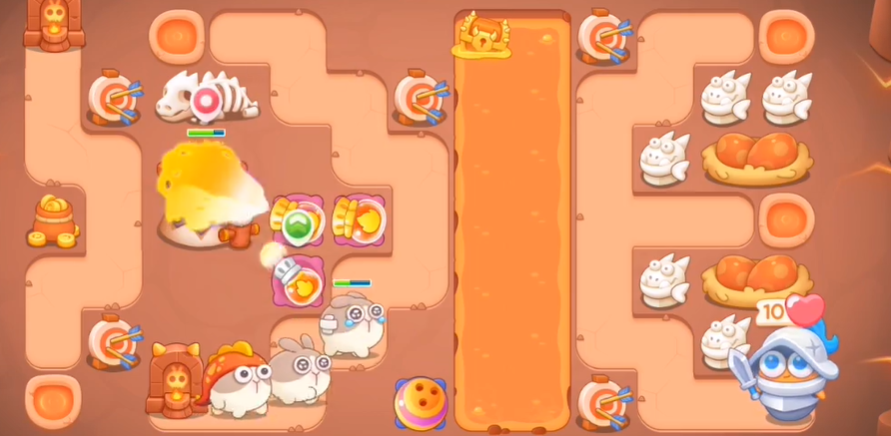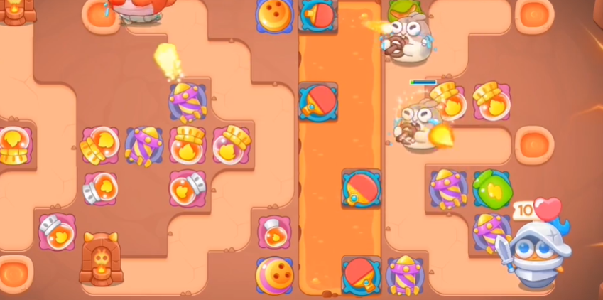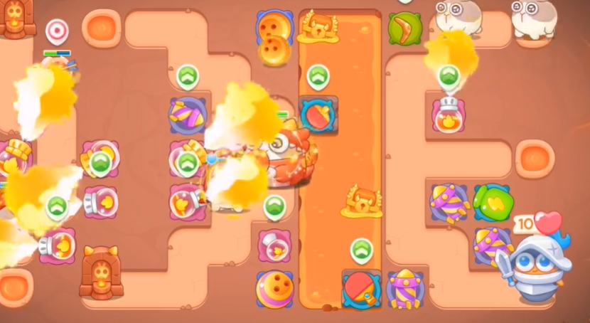 4、等钱够了之后现在右下角建造一个乒乓球炮塔和火箭炮塔在它们右上角建造一个火箭炮塔,左边的战场在左边建造一个喷火炮塔,最开始保龄球炮塔上方建一个喷火炮塔。