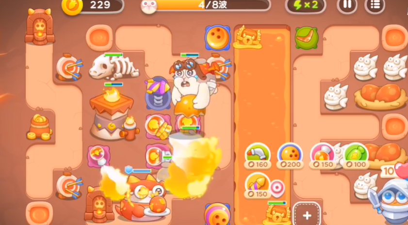 2、等钱足够了再在喷火炮塔下方和右方都造一个喷火炮塔并为它们升级让他们攻击左边建筑。