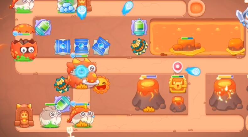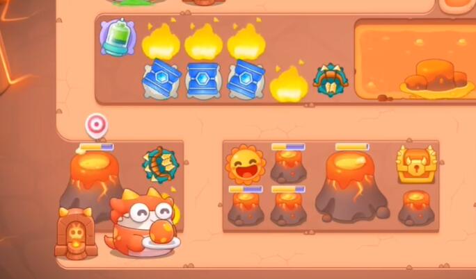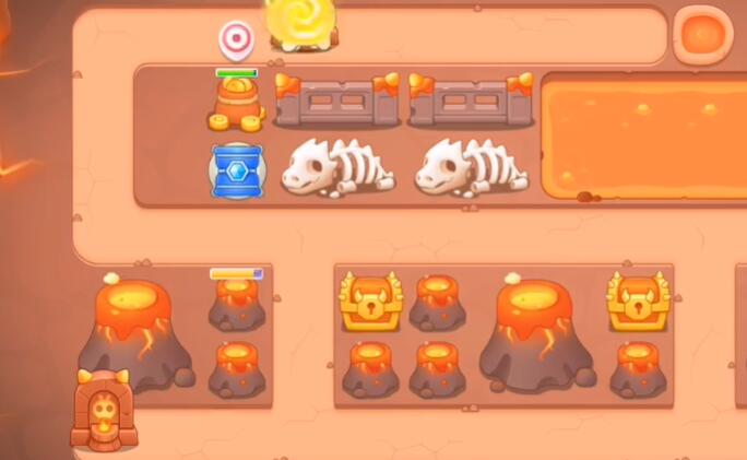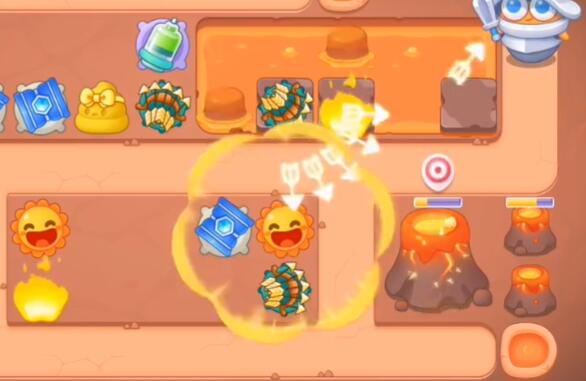 5、宝箱清理完之后,在位置上放置太阳,附近放上箭塔和桶子,然后锁定右边的火山。