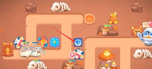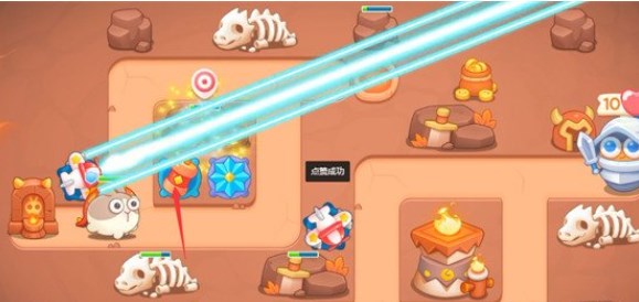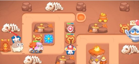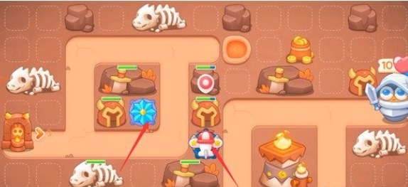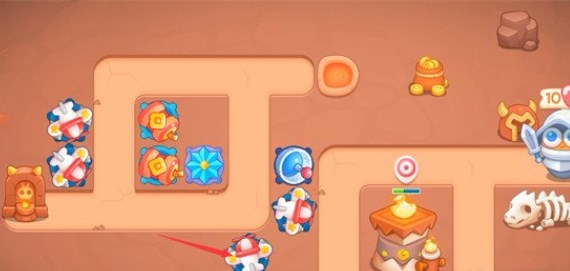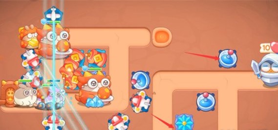 1、开局在如图所示位置又一个飞机塔和一个雪花塔,我们将这两座炮台升至满级,飞机塔的穿透攻击可以轻松清理上方的障碍物。