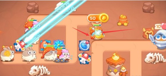 2、在如图所示位置补上一个飞机塔,并升至满级,雪花塔的范围冰冻配合飞机塔可以快速将敌方兔子击败