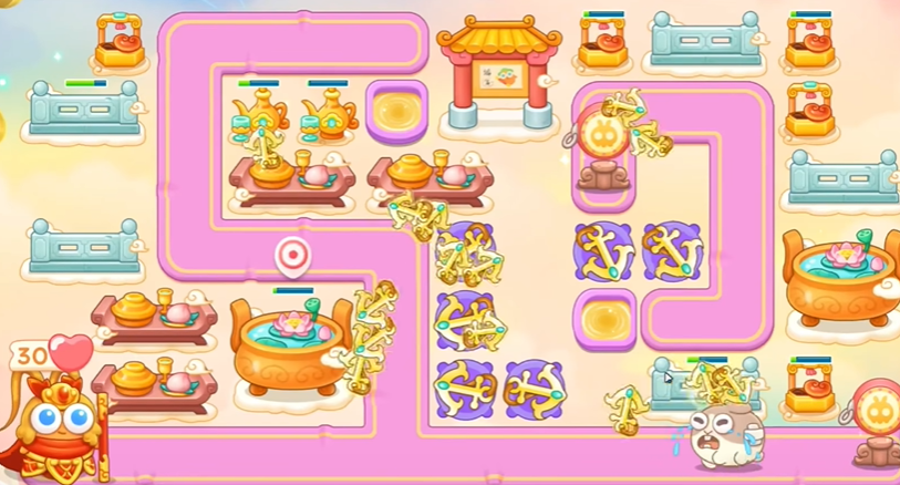 3、建立一个一级船锚,打钱袋,钱袋打掉,空出位置,建立船锚,继续清理周围障碍物,注意第二波有飞天兔,如果船锚没打死,在萝卜附近建立导弹。