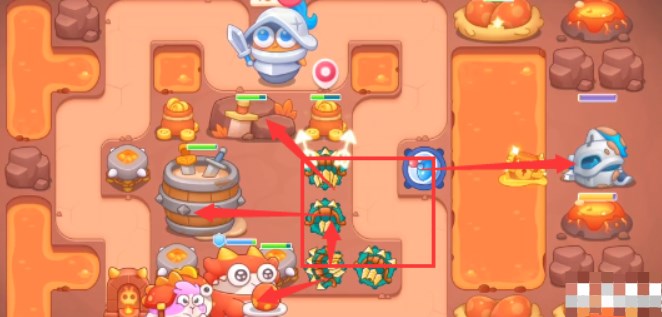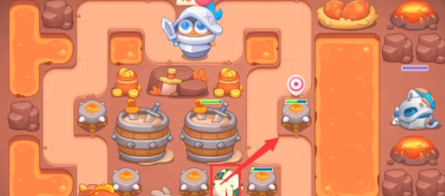 4、中间炮塔放的差不多就向右开图,可以在岩浆上打箱子爆出火瓶,之后快速打醒武士。