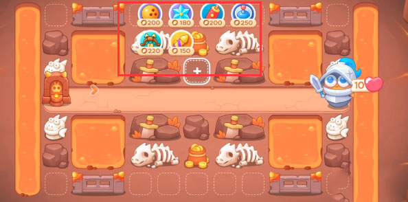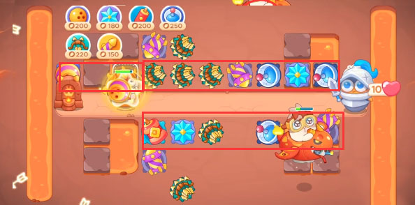 1、这一关可以使用的炮塔是:保龄球、雪花、鞭炮、雷达、多重箭、导弹,这一关我们主要输出用多重箭。