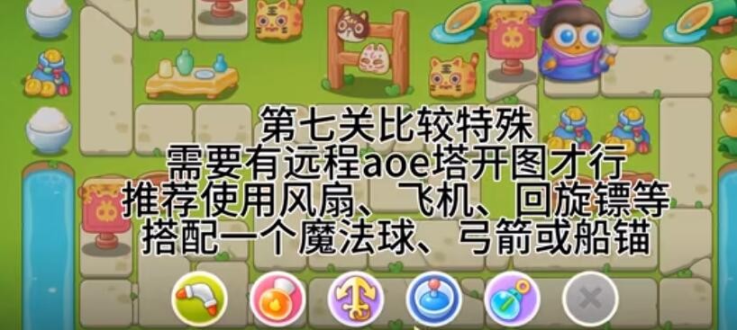 1、纸鸢探春第7关比较特殊,需要有远程aoe塔开图才行,推荐使用风扇、飞机、回旋镖等,搭配一个魔法球、弓箭或船锚。